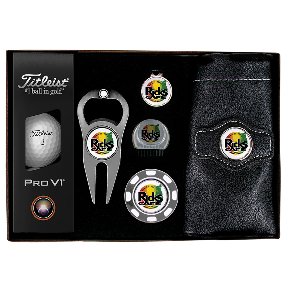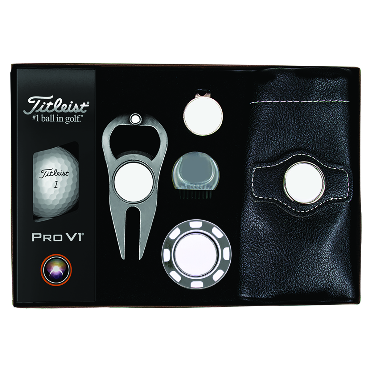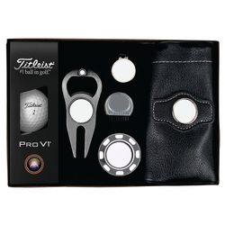Get people talking about your brand when they receive this Platinum Plus Golf Kit. Beautifully packaged in a gift box, this premium set includes three Titleist Pro V1 golf balls, a sleek metallic poker chip ball marker with a removable magnetic marker, a Hat Trick Divot Tool with a removable magnetic ball marker, a D Brush club cleaner, and a leatherette valuables pouch. Each item features a vibrant full-color imprint to keep your brand front and center on the course. Perfect for corporate promotions, client appreciation, tournaments, and branded giveaways.
