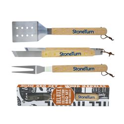 Budget friendly three piece BBQ set packaged in a retail box. Heavy duty construction with wood handles. Set contains (DCQWT) 13-1/4" Turner, (DCQWG) 13-1/2" Tongs and (DCQWF) 13-1/2" Fork
