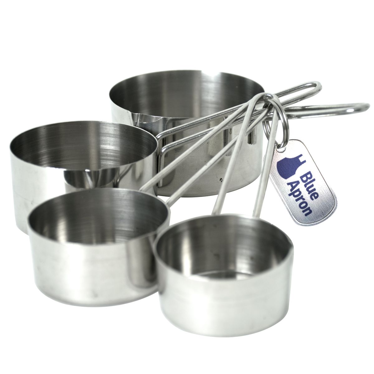 The stainless steel measuring cups are attached together with metal ring with tag that displays your logo. The four piece set includes cups that measure 1/4 cup, 1/3 cup, 1/2 cup and 1 cup.